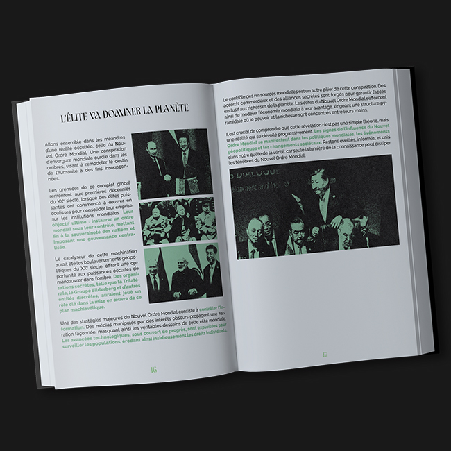 Dans cette collection, nous aborderons différents discours dans un ton informatif, empathique et captivant, décrivant les événements clés dans les différents domaines d'intérêt choisis. Chaque histoire sera présentée sous un titre accrocheur. Nos références générales pour ce projet sont les vidéos humoristiques "conspirationnistes" de Canal+, l'effet Mandela, le constructivisme et Edward Bernays.